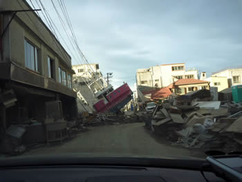 千葉さん宅の玄関から左に100mの交差点はまだふさがっているが、その日は自衛隊が重機を使いガレキを撤去していた。夕方には車が通れるようになっていた。